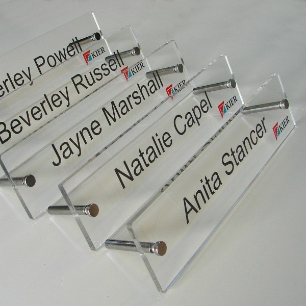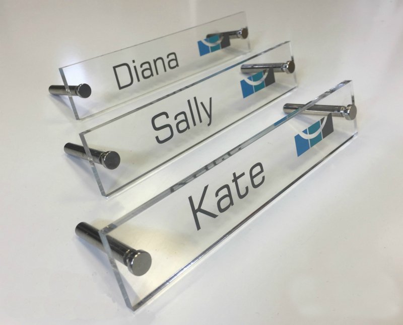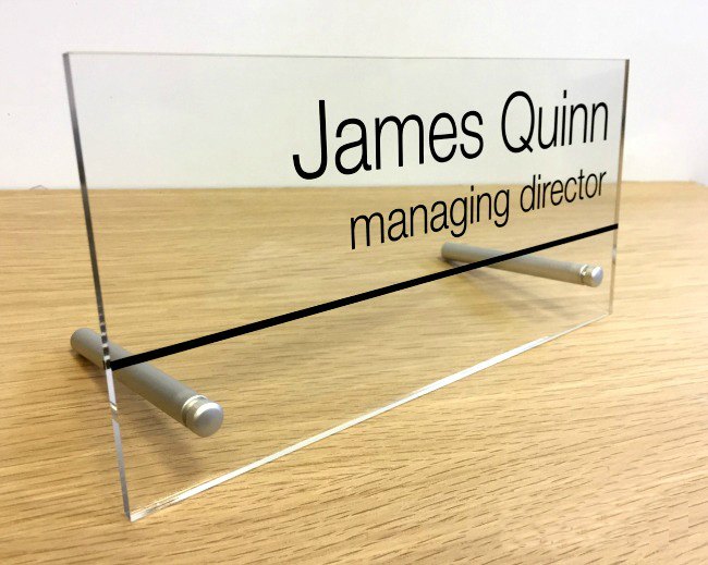 Produced from 5mm thick clear ‘glass effect’ cast acrylic these make for a stylish and contemporary sign that would enhance your reception area or help to easily identify staff and colleagues in a busy office environment. The addition of the satin aluminium standing legs offer a modern look and is a sign that you wouldn’t find anywhere else which will catch the eye of passers by.