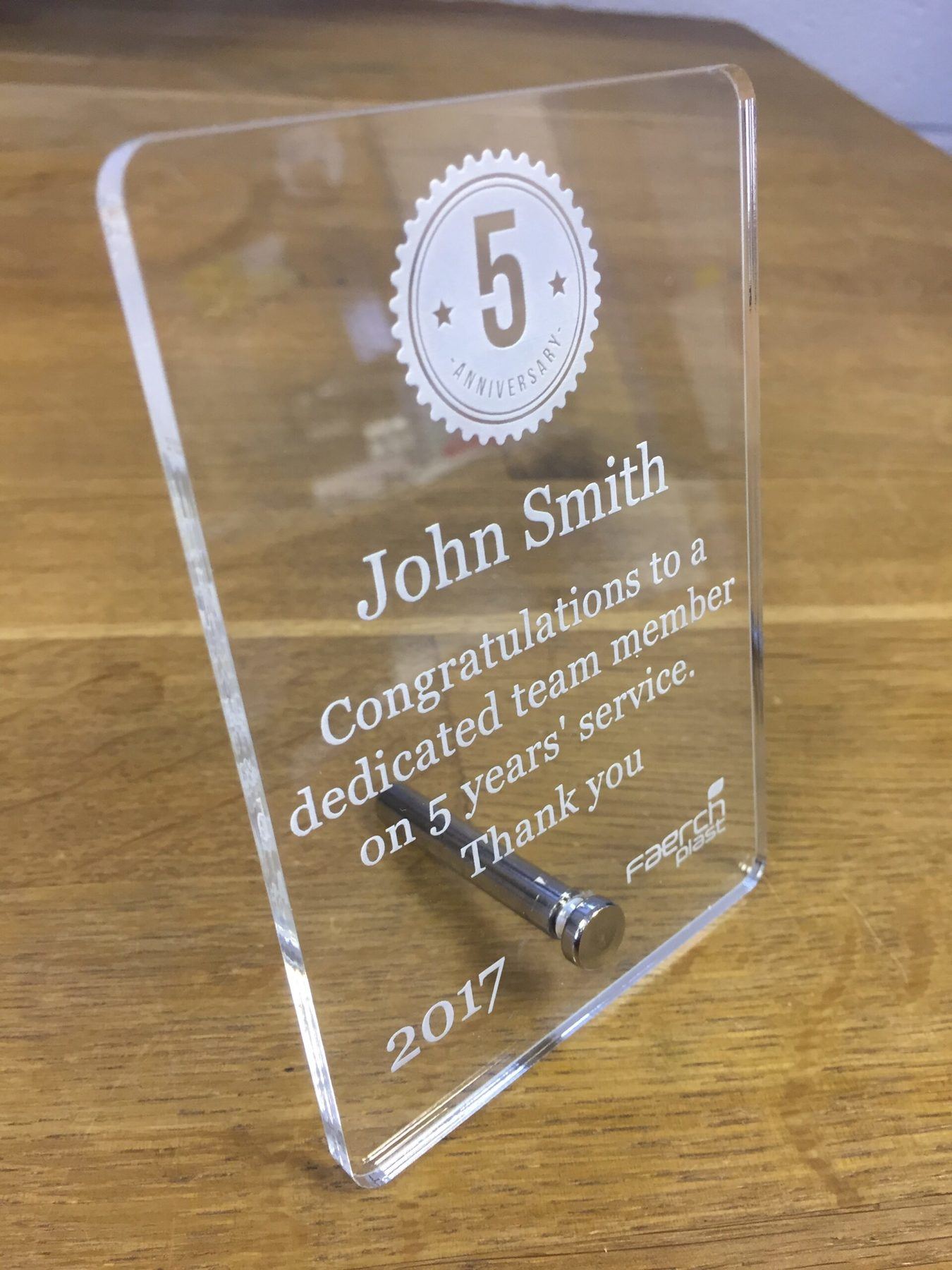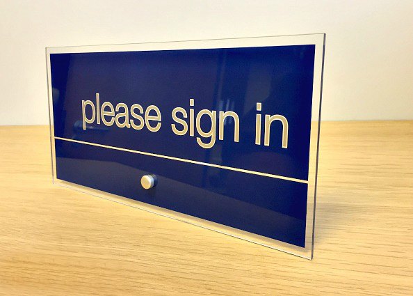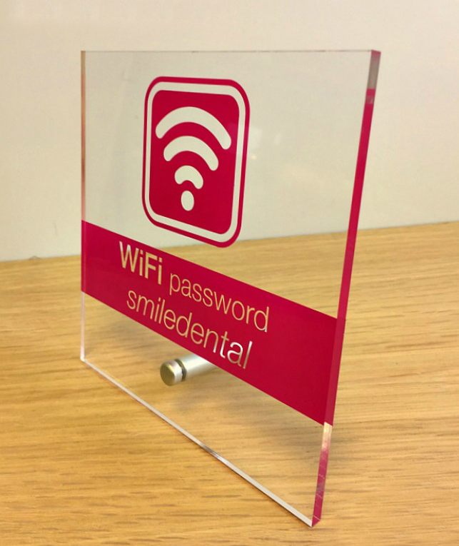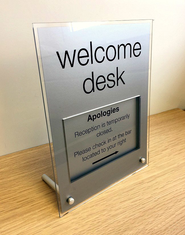 This acrylic desk sign is reverse printed, which protects the print from scratching or any wear and tear, it also creates a visual illuision that the branding and text are floating.